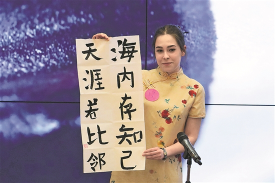 近日,在羅馬尼亞克盧日-納波卡,選手在第24屆“漢語橋”世界大學(xué)生中文比賽羅馬尼亞賽區(qū)決賽上展示書法作品。新華社發(fā)(路繼承 攝)