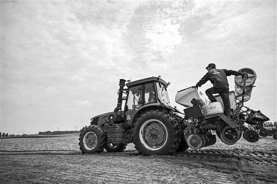 5月9日,在內(nèi)蒙古通遼市科爾沁左翼后旗巴胡塔蘇木伊和布拉格嘎查,農(nóng)民駕駛北斗導(dǎo)航的拖拉機(jī)播種。