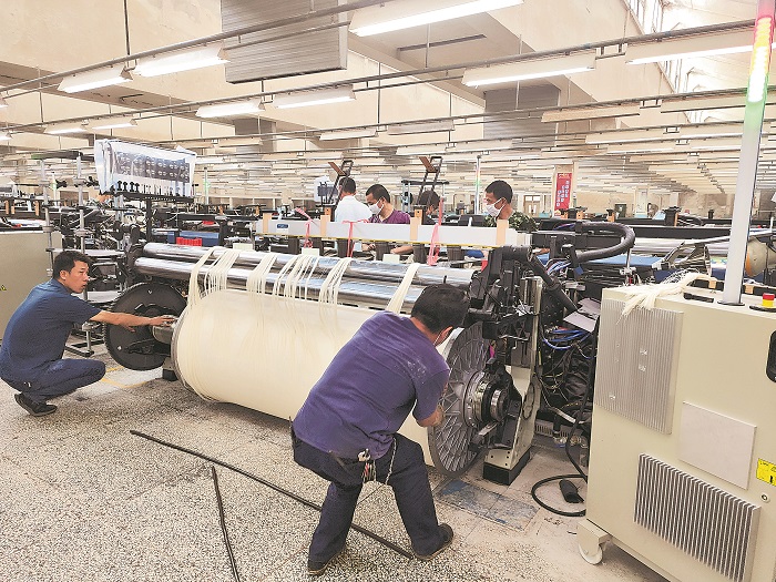 近日,在際華三五零九紡織有限公司織布車間,76臺(tái)230cm新凸織機(jī)技改項(xiàng)目落地實(shí)施,目前首批38臺(tái)設(shè)備已順利抵廠。5月9日,首臺(tái)新織機(jī)正式上軸投產(chǎn),設(shè)備組與操作工人協(xié)同作戰(zhàn),完成設(shè)備安裝調(diào)試,并開展新機(jī)型操作專項(xiàng)培訓(xùn)。喻珍 攝