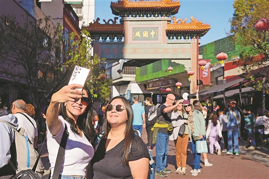 近日,市民在阿根廷布宜諾斯艾利斯的“中國(guó)城”牌坊前自拍。新華社記者 孟鼎博 攝