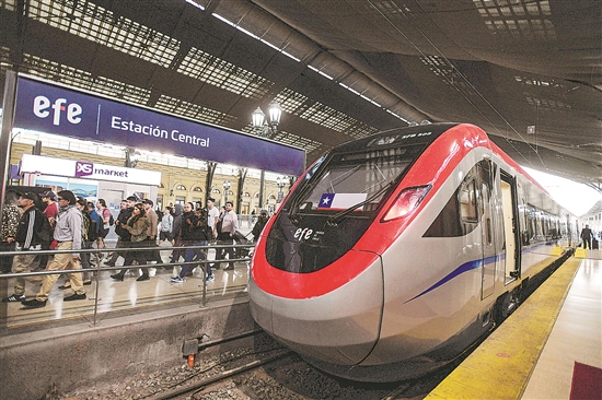 在智利圣地亞哥中央車站,中車四方研制的電力內(nèi)燃雙動(dòng)力動(dòng)車組等待發(fā)車。新華社發(fā)(豪爾赫·比列加斯 攝)