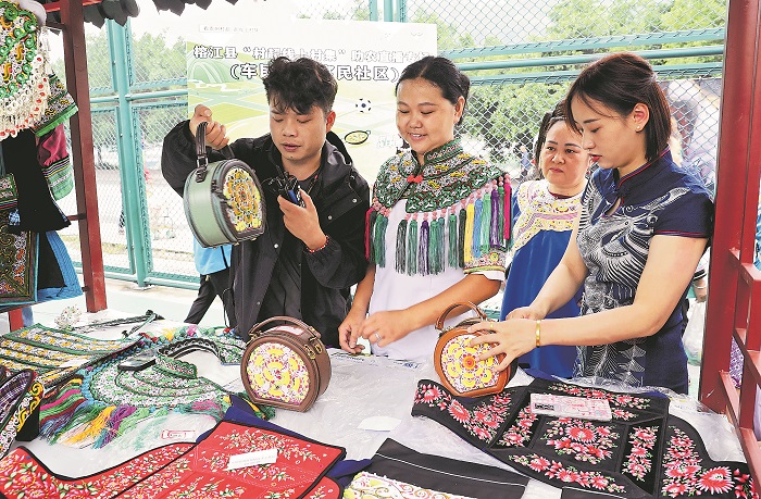 當(dāng)日,榕江縣車(chē)民街道在富民社區(qū)開(kāi)展“匠心傳承多彩民族”非遺展,鄉(xiāng)村新媒體主播在展播位上同步進(jìn)行線上推銷(xiāo),展示刺繡、蠟染、竹編、銀飾、服飾等民族手工藝產(chǎn)品,進(jìn)一步拓寬銷(xiāo)售渠道,助力村民增收。