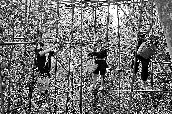 5月10日,廣西壯族自治區(qū)來(lái)賓市金秀瑤族自治縣羅香鄉(xiāng)羅運(yùn)村白牛屯村民在腳手架上采摘古樹(shù)茶葉。當(dāng)?shù)厥a(chǎn)的古樹(shù)茶葉野生在森林中,樹(shù)齡多在百年以上,因此茶樹(shù)高大。每到采摘季,村民需搭建腳手架采摘。
