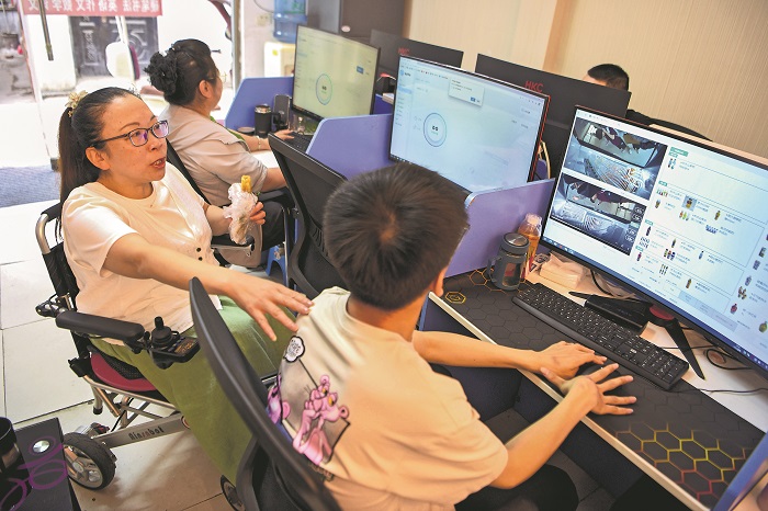 5月14日,一名殘疾人在助殘就業(yè)中心內(nèi)通過網(wǎng)絡(luò)進(jìn)行自動(dòng)售賣機(jī)后臺(tái)審核標(biāo)注工作。
