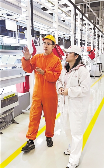 趙達(dá)(左)正在為本報(bào)記者柳姍姍介紹工業(yè)機(jī)器人系統(tǒng)運(yùn)維員工作內(nèi)容。