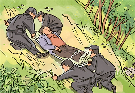 救援人員將受傷司機(jī)抬上擔(dān)架,向著陡坡艱難攀爬。170斤重的傷員,以及布滿樹根、藤條的陡坡,考驗(yàn)著大家的體力。龍步昌一只手穩(wěn)穩(wěn)抬著擔(dān)架,另一只手抓住陡坡上的樹根與藤條,雙腳在陡峭坡面尋找著力點(diǎn),手腳并用,一寸一寸地艱難攀爬。