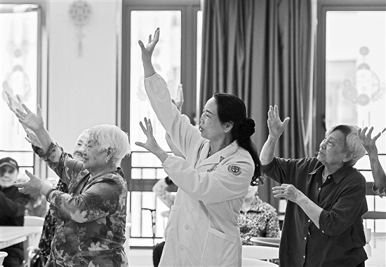 5月12日,浙江省金華市金東區(qū)多湖街道社區(qū)衛(wèi)生服務(wù)中心醫(yī)養(yǎng)中心,醫(yī)務(wù)人員和老人們一起做操。該中心從老年群體的訴求出發(fā),整合醫(yī)養(yǎng)資源,打造了集“醫(yī)療+養(yǎng)老”為一體的醫(yī)養(yǎng)中心,為老年人提供便利服務(wù)。本報通訊員 時寬兵 攝