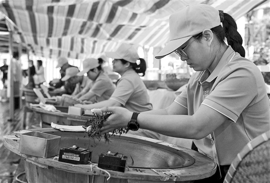 5月18日,浙江省金華市茶葉加工工職業(yè)技能競賽開賽,各個縣市(區(qū))選拔推薦的30名炒茶能手參加比賽。在200分鐘時間里,選手們比拼炒茶手勢、熟練程度、新葉是否符合每個環(huán)節(jié)的標準等,由專業(yè)評委打分選拔出名次。本報通訊員 時寬兵 攝