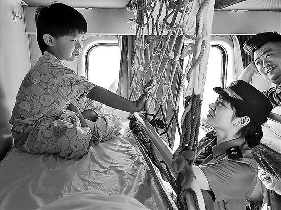 在呼和浩特與昆明間往返的K691/2次列車上,中國鐵路呼和浩特局集團(tuán)有限公司包頭客運段昆明車隊的列車員們用行動詮釋著優(yōu)質(zhì)服務(wù),為旅客鋪就安心出行路。圖為列車員李亞娟為乘坐上鋪的幼兒安裝便攜式固定安全防護(hù)網(wǎng)。