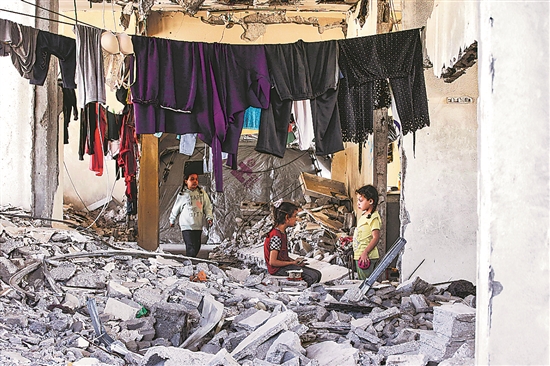 圖為近日,在加沙地帶北部的杰巴利耶難民營(yíng),巴勒斯坦女童在廢墟里玩耍。
