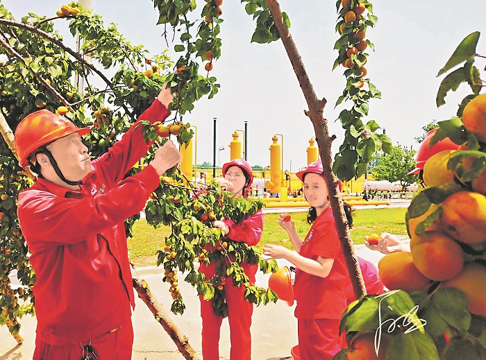 中國石化中原油田天然氣產(chǎn)銷廠深入開展“綠色基層單位”創(chuàng)建活動,依靠科技創(chuàng)新推廣光伏發(fā)電,加大壓縮機組碳排放監(jiān)測治理,嚴格施工現(xiàn)場揚塵防控措施,使油氣生產(chǎn)現(xiàn)場變成“綠色企業(yè)行動”基地。圖為該廠東濮采氣區(qū)員工在“花園式”集氣站采摘紅杏。