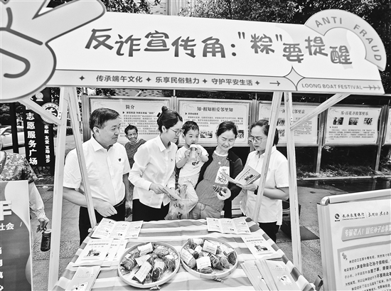 5月22日,浙江省湖州市長興縣雉城街道所前社區(qū)開展“傳承端午文化·樂享民俗魅力·守護平安生活”端午主題活動,開展傳統(tǒng)提線木偶表演、創(chuàng)意手工制作、端午民俗體驗、反詐宣傳、垃圾分類等活動。圖為該市長興農(nóng)商銀行城東支行工作人員在活動現(xiàn)場給居民普及金融反詐知識。