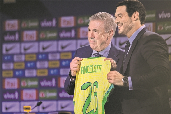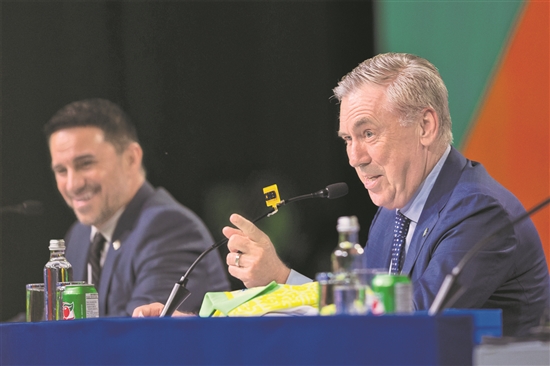 巴西隊主教練安切洛蒂(右)在新聞發(fā)布會上。新華社發(fā)(克勞迪婭·馬爾提尼 攝)