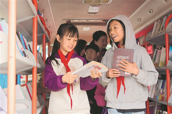 5月28日,云南省昭通市大關(guān)縣翠華鎮(zhèn)慶云小學(xué)的學(xué)生們在“流動圖書車”內(nèi)挑選感興趣的書籍。當(dāng)日,“背篼圖書館”志愿服務(wù)隊和大關(guān)縣科學(xué)技術(shù)協(xié)會志愿者來到該小學(xué),學(xué)生們分享閱讀心得、參與科普問答,在歡樂的氛圍中迎接“六一”兒童節(jié)。新華社記者 高詠薇 攝