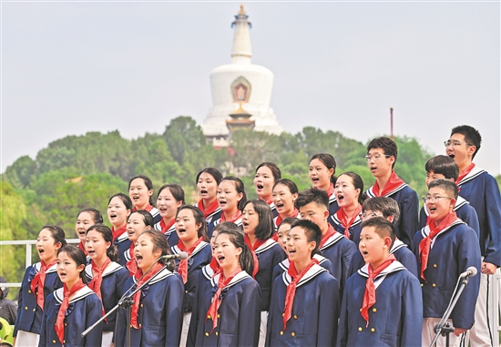 當(dāng)日,第三屆“讓我們蕩起雙槳”首都少年兒童慶祝“六一”國(guó)際兒童節(jié)主題活動(dòng)在北京北海公園舉辦。來(lái)自北京市10支少年合唱團(tuán)的少先隊(duì)員們?cè)诎姿路鸥瑁瑧c祝即將到來(lái)的兒童節(jié)。活動(dòng)現(xiàn)場(chǎng)還舉辦了小學(xué)生科技社團(tuán)展示、紅領(lǐng)巾志愿者宣講等活動(dòng),展現(xiàn)新時(shí)代少年兒童精神風(fēng)貌?;顒?dòng)由北京青少年服務(wù)中心主辦。新華社記者 陳鐘昊 攝