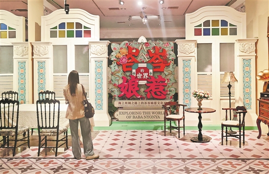 日前,在北京首都博物館舉行的“峇峇娘惹的世界——海上絲綢之路上的峇峇娘惹文化展”上,市民參觀南洋風(fēng)客廳。自15世紀(jì)起,移民到東南亞的華人歷經(jīng)數(shù)代人的奮斗,將中華文化與當(dāng)?shù)匚幕嗳冢纬闪霜?dú)具特色的“峇峇娘惹”文化。此次展覽是首都博物館“世界文明交流互鑒”系列展覽的組成部分。展覽通過百余件精選文物及多元展示手段,系統(tǒng)梳理峇峇娘惹社群的歷史脈絡(luò)與文化面貌。
