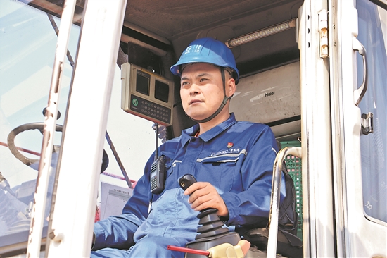 圖為王加全正在進(jìn)行吊車作業(yè)。本報記者 張嬙 攝