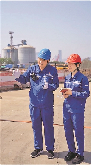本報記者張嬙(右)跟著勞模王加全探訪吊車作業(yè)。