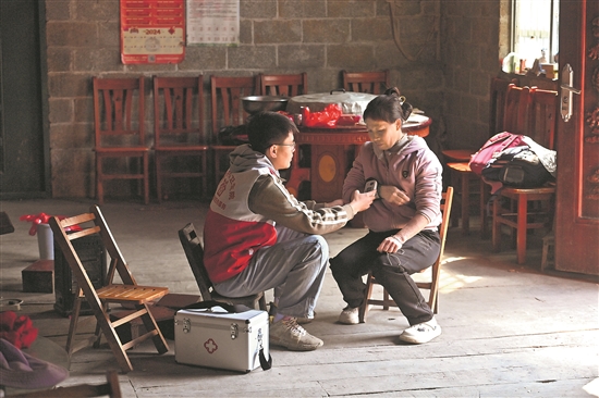 在大山里,村民遇到重病急病,就需要背著或抬著通過(guò)懸崖,下山就醫(yī)。切身感受到村民就醫(yī)難的蒙富松覺(jué)得醫(yī)生是神圣的職業(yè),從小就立志當(dāng)一名醫(yī)生。2021年9月,從衛(wèi)校畢業(yè)后,未滿19歲的蒙富松回到家鄉(xiāng),在村衛(wèi)生室擔(dān)任醫(yī)生。作為村里唯一的村醫(yī),他深感責(zé)任重大。