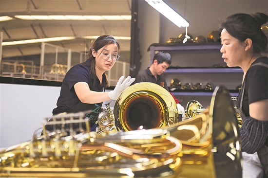 5月28日,河北省武強(qiáng)縣一家樂(lè)器生產(chǎn)企業(yè)的工人在檢查樂(lè)器質(zhì)量。