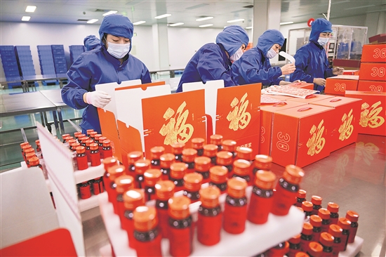 工作人員在位于銀川市賀蘭縣的寧夏百瑞源枸杞包裝車間打包枸杞產(chǎn)品(2025年2月7日攝)。