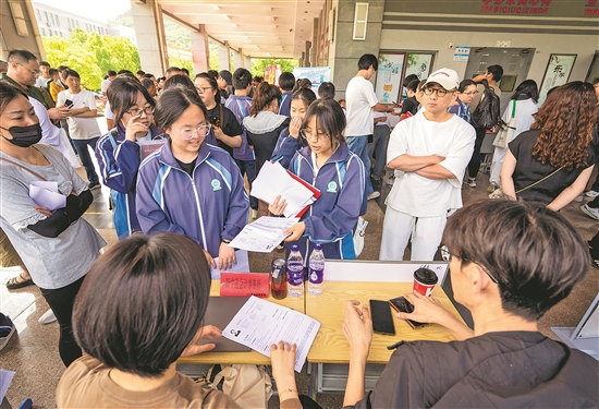 6月3日,浙江省湖州市長興職教集團回龍山校區(qū),學生在就業(yè)實習招聘會現(xiàn)場了解崗位信息。在當天的招聘會上,來自新能源、智能裝備、數(shù)字產(chǎn)業(yè)等不同領域的近50家用人單位提供近千個就業(yè)崗位,吸引了260多名實習生前來競聘擇業(yè),不少崗位招聘出現(xiàn)爭搶實習生的現(xiàn)象。本報通訊員 譚云俸 攝