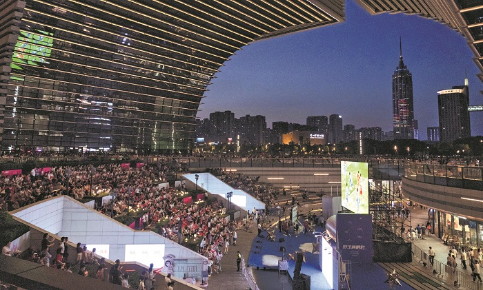 8月3日,大量市民聚集在常州市民文化廣場觀看比賽直播,“隔空”為在鹽城比賽的常州隊加油。