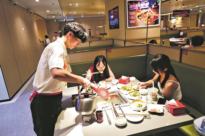8月6日晚,鹽城隊隊員單偉在鹽城市寶龍廣場海底撈火鍋店工作。