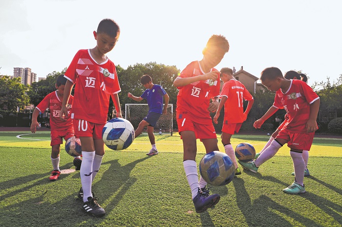 7月29日下午,南京隊隊員白洋(左三)來到邁皋橋小學帶領(lǐng)孩子們訓練。7月20日晚,“蘇超”第七輪南京客戰(zhàn)揚州,白洋在傷停補時階段進球,幫助南京隊將比分鎖定5比1,大勝揚州隊。