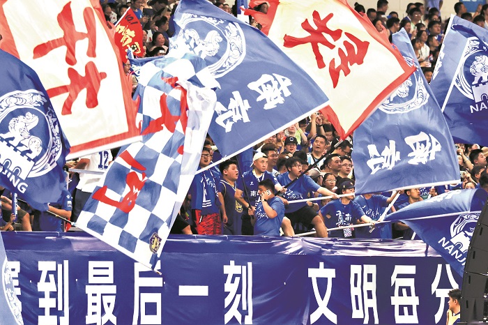 7月5日,“蘇超”第六輪南京對陣蘇州,南京球迷揮旗吶喊。