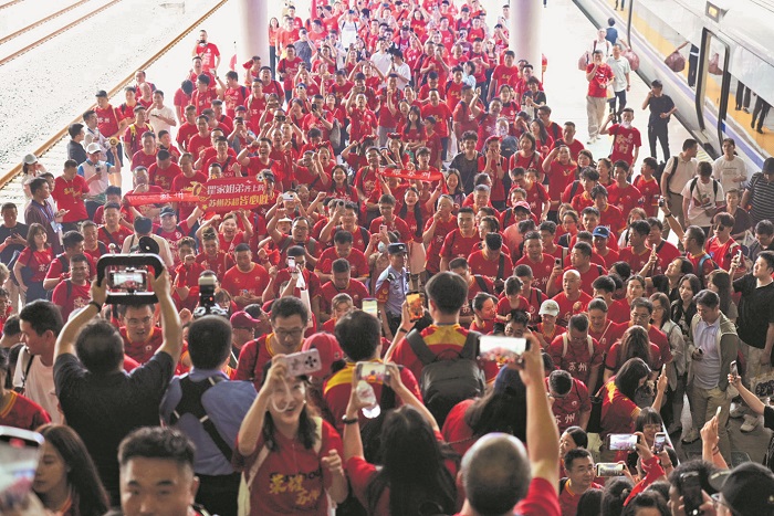 8月2日,蘇州球迷乘坐“蘇超專列”抵達淮安,高鐵淮安東站迎來一片“紅色海洋”。
