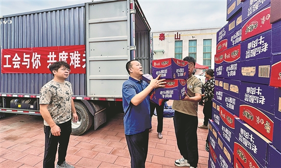 8月10日,在甘肅省蘭州市榆中縣捐贈(zèng)物資指定接收點(diǎn),蘭州市總工會(huì)緊急采購(gòu)的物資被迅速分發(fā)到搶險(xiǎn)救援一線。