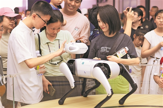 8月10日,在2025世界機(jī)器人大會(huì)上,觀眾與智能伴隨機(jī)器人積極互動(dòng)。