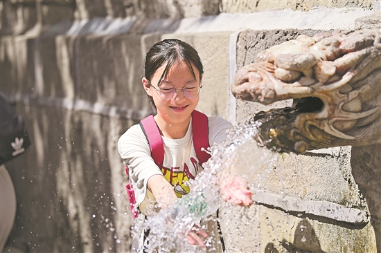 一名游客在山西太原晉祠難老泉感受泉水的清冽。