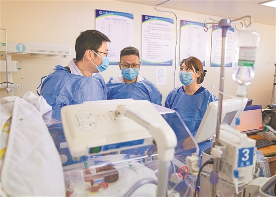 在那曲市人民醫(yī)院新生兒重癥監(jiān)護(hù)室,來(lái)自大連醫(yī)科大學(xué)附屬第一醫(yī)院的援藏醫(yī)生田聰亮(左)與吉美多布杰(中)、護(hù)士旦珍合作,為一名早產(chǎn)兒實(shí)施機(jī)械通氣治療(7月18日攝)。吉美多布杰2003年從四川大學(xué)華西醫(yī)學(xué)院畢業(yè)來(lái)到那曲市人民醫(yī)院工作,他先后和8批援藏專家合作、學(xué)習(xí)。
