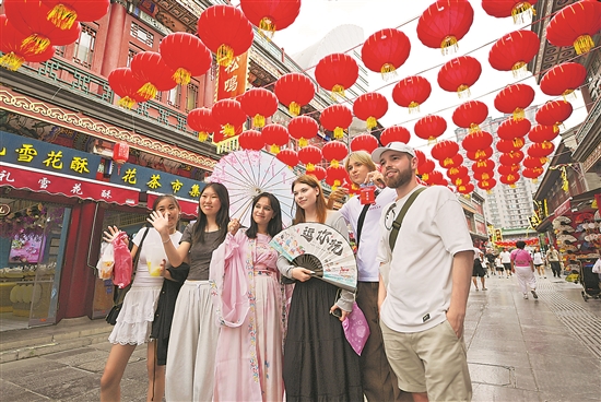 當(dāng)日,2025“漢語(yǔ)橋”天津師范大學(xué)“上合之約”學(xué)生中文交流營(yíng)在天津古文化街舉行探訪活動(dòng),來(lái)自俄羅斯、哈薩克斯坦、烏茲別克斯坦等上合國(guó)家的100名青年學(xué)子走進(jìn)古街,感受中國(guó)傳統(tǒng)文化魅力。新華社記者 李然 攝