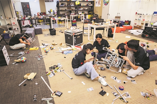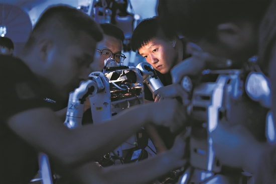8月7日,北京市十一學(xué)校的高中生正在設(shè)計(jì)和組裝機(jī)器人。作為高中生,他們?yōu)槟芤?jiàn)證和參加首屆世界人形機(jī)器人運(yùn)動(dòng)會(huì)深感榮幸。