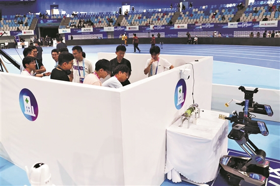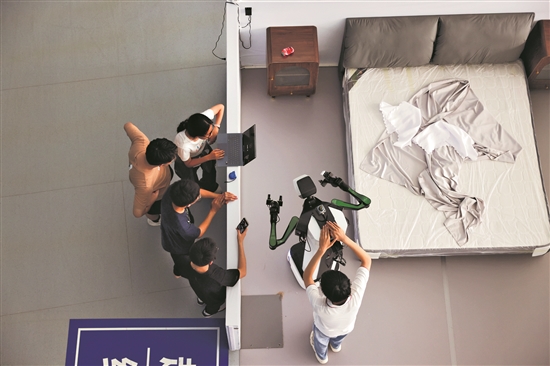 8月4日,參加場(chǎng)景賽的參賽隊(duì)正在“酒店客房”調(diào)試機(jī)器人,讓其在比賽中可以更加精準(zhǔn)高效。