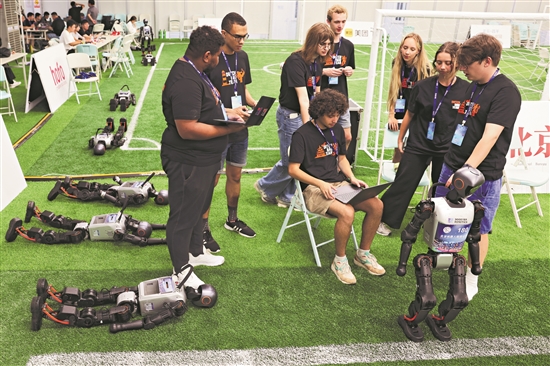 8月4日,參加人形機(jī)器人足球賽的外國(guó)參賽隊(duì)正在調(diào)試機(jī)器人。