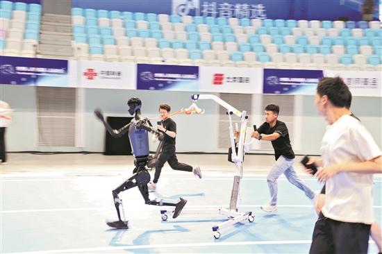 8月11日,天工機(jī)器人團(tuán)隊(duì)在國(guó)家速滑館進(jìn)行賽前測(cè)試。