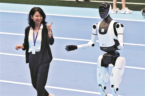 8月14日,2025世界人形機(jī)器人運(yùn)動(dòng)會(huì)開(kāi)幕式前,一名女士與人形機(jī)器人進(jìn)行互動(dòng)。