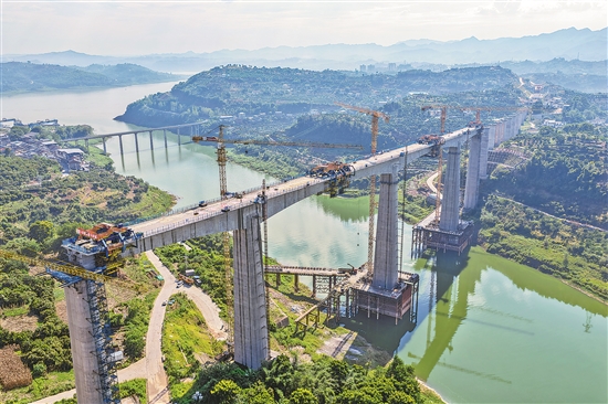 這是8月18日拍攝的渝萬(wàn)高鐵渠溪河雙線特大橋施工現(xiàn)場(chǎng)。
