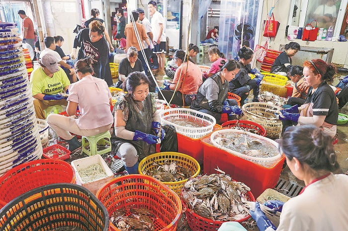 8月18日,浙江省舟山市普陀區(qū),舟山國際水產(chǎn)城里,經(jīng)營戶和工人們正在按級(jí)分揀梭子蟹,準(zhǔn)備銷往各地市場(chǎng),一派繁忙景象。
