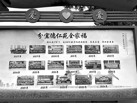暑假,德仁苑依然照常運(yùn)轉(zhuǎn)著——每年夏天,總有一部分孩子因?yàn)楦鞣N原因選擇留在那里度過(guò)假期。如果是初次走進(jìn)那個(gè)院子,人們大多會(huì)被距離鐵門(mén)不遠(yuǎn)處的一塊展板吸引。展板上共有17張照片,那是自德仁苑創(chuàng)立起,黃梅生和孩子們歷年拍下的全家福。照片里的孩子換了一批又一批,黃梅生也從黑發(fā)變成了白發(fā)。