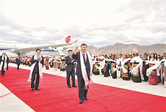 充滿節(jié)日氛圍的古城拉薩,從機場到住地主要街道兩旁彩旗舞動,各族群眾手持紅旗、捧著哈達,齊聲歡呼,表達歡迎和感激之情。習近平打開車窗,向沿途群眾頻頻揮手致意。