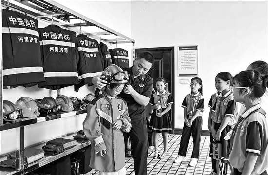 8月16日,河南省濟源市文昌路小學的學生在濟源市濟水同心街消防救援站體驗穿戴滅火防護裝備。