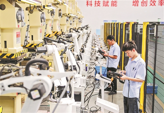 8月20日,四川省華鎣市華鎣山經(jīng)開區(qū)怡田科技有限公司的員工,在智能車間操控機(jī)器生產(chǎn)外貿(mào)訂單產(chǎn)品。