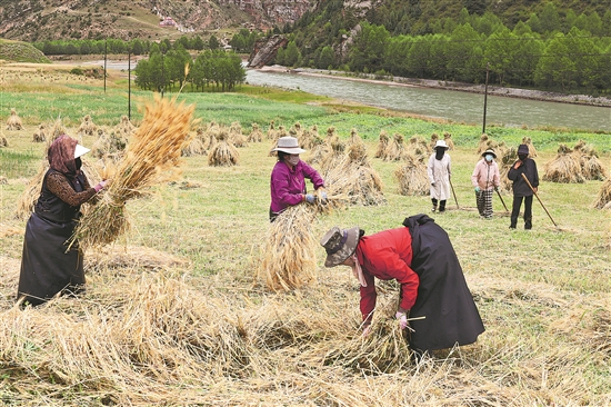 8月21日,青海省囊謙縣毛莊鄉(xiāng)孜榮村,農(nóng)牧民正在收割青稞。