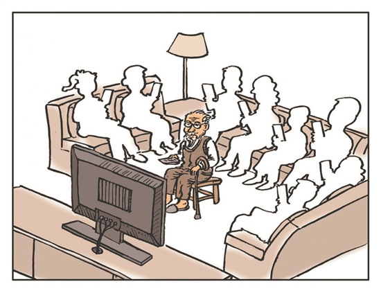 孤獨(dú)者大多喜歡回憶。老人家或許想起自己的爺爺,那時(shí)家里還沒(méi)有電視機(jī),但沒(méi)有哪個(gè)后代敢忽視他的存在,爺爺想聽(tīng)的戲,孩子都得競(jìng)相學(xué)唱。老人家可能想起自己的父親,一位和藹可親的大“暖男”,盡管家里已經(jīng)有了電視,但孫兒們最喜歡他講的故事。等輪到自己也當(dāng)爺爺了,生活條件是父輩祖輩想都不敢想的,而他此時(shí)面臨的嘲弄式孤獨(dú),更是先輩們無(wú)法想象的。