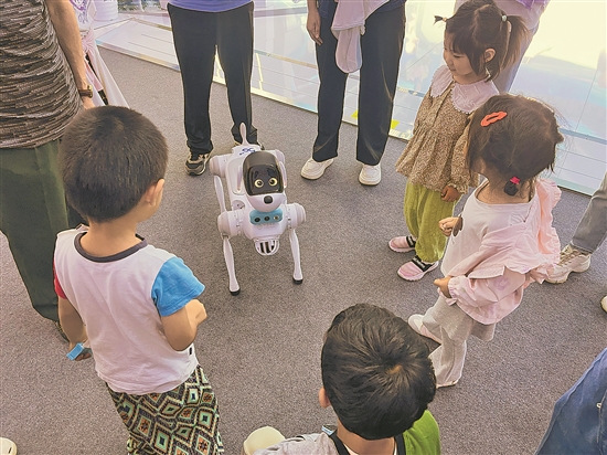 在中國(guó)移動(dòng)展臺(tái),靈犀機(jī)器狗吸引了不少觀眾駐足與其互動(dòng)。據(jù)悉,該機(jī)器狗產(chǎn)品具備多地形自適應(yīng)、智能提醒、智能陪伴學(xué)習(xí)、智慧家庭安防與通信等多種能力。本報(bào)記者 楊召奎 攝